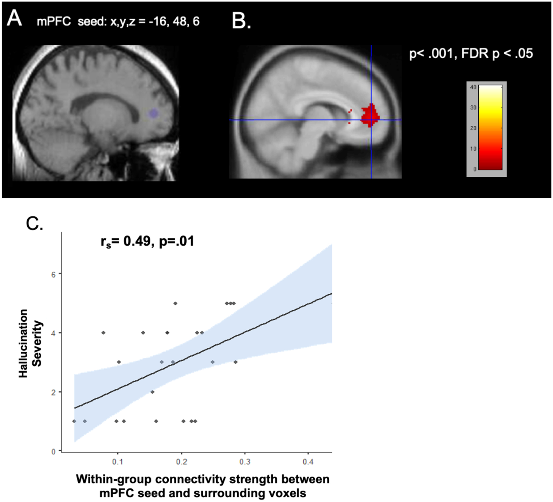A neural biomarker for hallucinations: medial prefrontal aberrations in neural connectivity predict self-agency deficits and hallucination severity in schizophreniaShalaila S Haas, Leighton BN Hinkley, Melissa Fisher, and 3 more authorsJournal of brain research, May 2021Prior studies have shown that the medial prefrontal cortex (mPFC) represents one neural substrate that mediates judgments of self-agency (i.e., the awareness that ‘I am the originator of my actions’). Patients with schizophrenia (SZ) manifest cardinal self-agency deficits that contribute to debilitating psychotic symptoms (e.g. hallucinations) and distort reality monitoring. This is the first study in which we examine across 2 SZ samples, the mPFC site that underlies self-agency deficits during an explicit reality-monitoring task (i.e., while subjects distinguish self-generated information from externally-derived information) in one SZ sample, and link intrinsic functional connectivity (iFC) during rest within this a priori task-evoked self-agency seed with hallucination symptoms in a different SZ sample. In particular, we examined the iFC between the mPFC site that underlies self-agency deficits with all other brain regions in SZ using resting-state functional magnetic resonance imaging (fMRI). Resting-state fMRI data were collected from 32 SZ and 28 age, gender, and education-matched healthy control (HC) subjects. Functional connectivity maps were computed for each subject and compared between the HC and SZ groups. Within-group and between-group analyses revealed that aberrant iFC in this a priori-defined mPFC ‘self-agency seed’ predicted hallucination severity. The present findings reveal that the neural aberrations in this mPFC site represents one cardinal biomarker that underlies explicit self-agency deficits during a reality-monitoring task in one SZ sample that generalized to aberrant iFC differences in a different SZ sample and predicted worsening psychotic hallucinatory experiences. This region may represent a key neurobiological target for treatment avenues to improve hallucinatory symptoms.