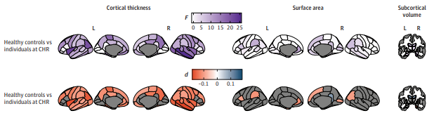 Association of structural magnetic resonance imaging measures with psychosis onset in individuals at clinical high risk for developing psychosis: an ENIGMA working group mega-analysisMaria Jalbrzikowski, Rebecca A Hayes, Stephen J Wood, and 8 more authorsJAMA psychiatry, Jul 2021Importance: The ENIGMA clinical high risk (CHR) for psychosis initiative, the largest pooled neuroimaging sample of individuals at CHR to date, aims to discover robust neurobiological markers of psychosis risk. Objective: To investigate baseline structural neuroimaging differences between individuals at CHR and healthy controls as well as between participants at CHR who later developed a psychotic disorder (CHR-PS+) and those who did not (CHR-PS−). Design, Setting, and Participants: In this case-control study, baseline T1-weighted magnetic resonance imaging (MRI) data were pooled from 31 international sites participating in the ENIGMA Clinical High Risk for Psychosis Working Group. CHR status was assessed using the Comprehensive Assessment of At-Risk Mental States or Structured Interview for Prodromal Syndromes. MRI scans were processed using harmonized protocols and analyzed within a mega-analysis and meta-analysis framework from January to October 2020. Main Outcomes and Measures: Measures of regional cortical thickness (CT), surface area, and subcortical volumes were extracted from T1-weighted MRI scans. Independent variables were group (CHR group vs control group) and conversion status (CHR-PS+ group vs CHR-PS− group vs control group). Results: Of the 3169 included participants, 1428 (45.1%) were female, and the mean (SD; range) age was 21.1 (4.9; 9.5-39.9) years. This study included 1792 individuals at CHR and 1377 healthy controls. Using longitudinal clinical information, 253 in the CHR-PS+ group, 1234 in the CHR-PS− group, and 305 at CHR without follow-up data were identified. Compared with healthy controls, individuals at CHR exhibited widespread lower CT measures (mean [range] Cohen d = −0.13 [−0.17 to −0.09]), but not surface area or subcortical volume. Lower CT measures in the fusiform, superior temporal, and paracentral regions were associated with psychosis conversion (mean Cohen d = −0.22; 95% CI, −0.35 to 0.10). Among healthy controls, compared with those in the CHR-PS+ group, age showed a stronger negative association with left fusiform CT measures (F = 9.8; P < .001; q < .001) and left paracentral CT measures (F = 5.9; P = .005; q = .02). Effect sizes representing lower CT associated with psychosis conversion resembled patterns of CT differences observed in ENIGMA studies of schizophrenia (ρ = 0.35; 95% CI, 0.12 to 0.55; P = .004) and individuals with 22q11.2 microdeletion syndrome and a psychotic disorder diagnosis (ρ = 0.43; 95% CI, 0.20 to 0.61; P = .001). Conclusions and Relevance: This study provides evidence for widespread subtle, lower CT measures in individuals at CHR. The pattern of CT measure differences in those in the CHR-PS+ group was similar to those reported in other large-scale investigations of psychosis. Additionally, a subset of these regions displayed abnormal age associations. Widespread disruptions in CT coupled with abnormal age associations in those at CHR may point to disruptions in postnatal brain developmental processes.